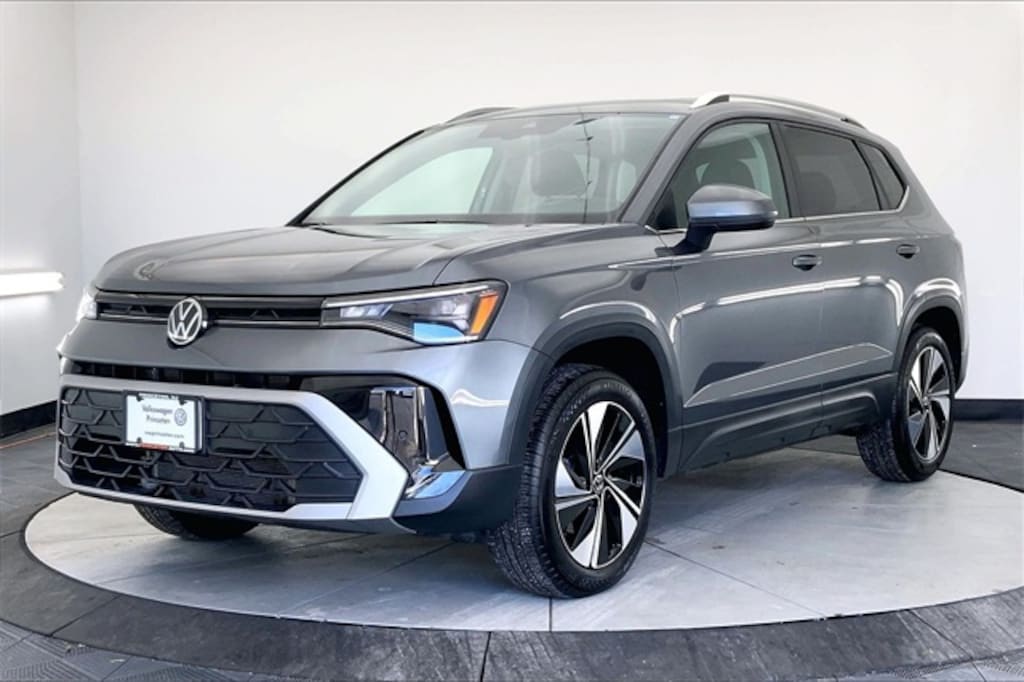Platinum Gray Metallic 2025 Volkswagen Taos AWD 8-Speed Automatic with Tiptronic 1.5L I4 Turbocharged DOHC 16V LEV3-SULEV30 174hp Apple Car Play, Panoramic Sunroof Package.