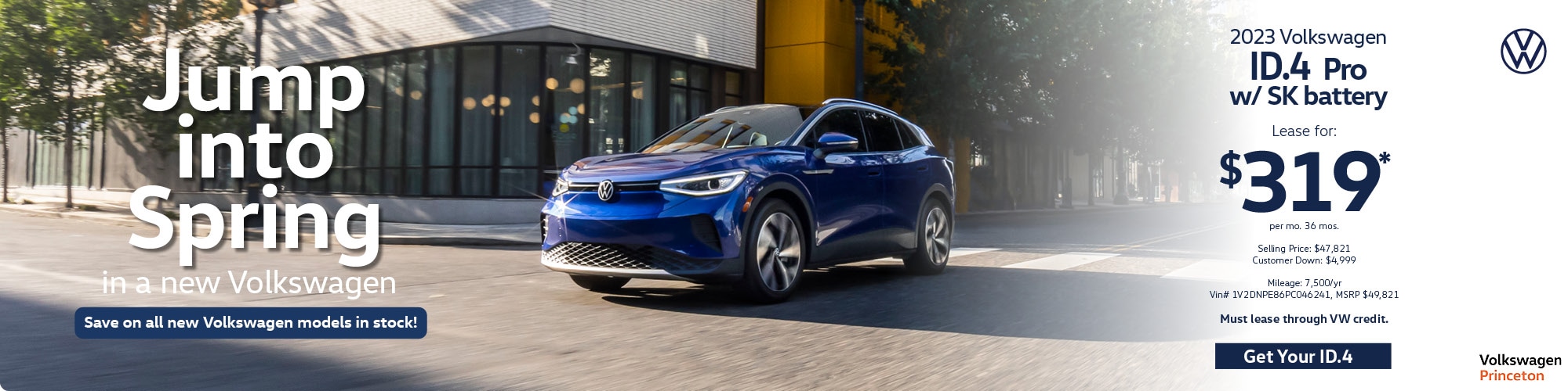 *All prices exclude tax, title, licensing, destination, dealer fees, bank fee, 1st month, & MV fees. Excludes $699 documentation fee. MSRP: $49,821. $4,999 due at signing plus tax, tags, MV fees & dealer fees. $0 sec dep. Ttl pymt/Residual: $14,484/$26,405.13. Includes $9250 EV Lease Bonus. Must finance through Volkswagen Credit to qualify. Must finance vehicle at standard rate. See dealer for complete details. Offers expire 3/4/24.