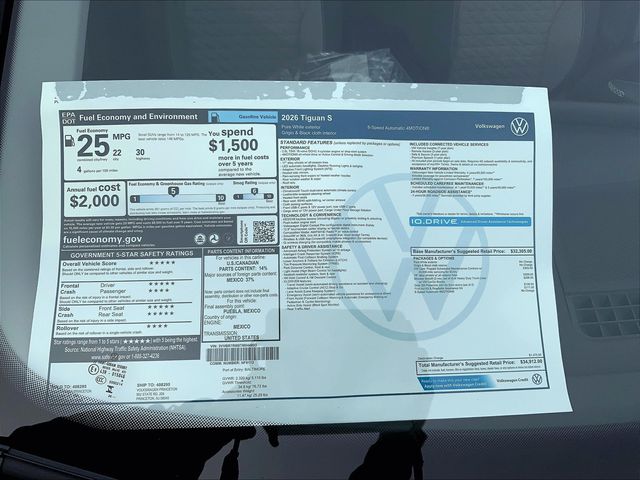 White 2026 Volkswagen Tiguan 2.0T S AWD 8-Speed Automatic 2.0L TSI DOHC