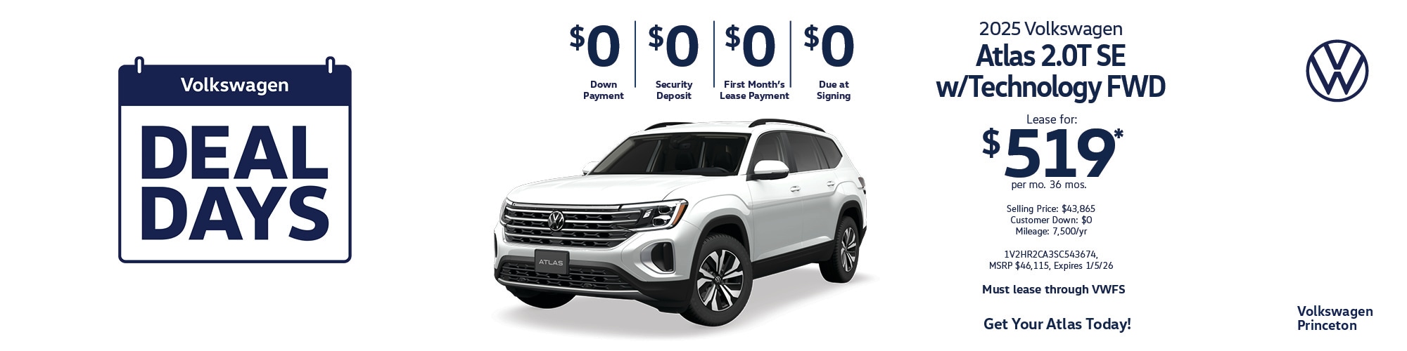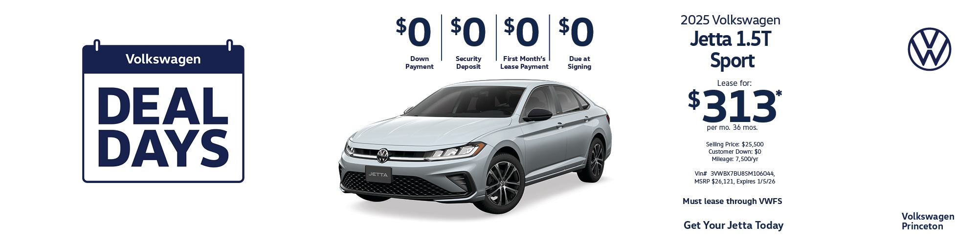 *All prices exclude tax, title, licensing, destination, dealer fees, bank fee, 1st month, & MV fees. Excludes $899 documentation fee. MSRP: $094. $0 due at signing plus tax, tags, MV fees & dealer fees. $0 sec dep. Ttl pymt/Residual: $12,132/$20,518. Must finance through Volkswagen Credit to qualify. Must finance vehicle at standard rate. See dealer for complete details. Offers expire 1/5/26.