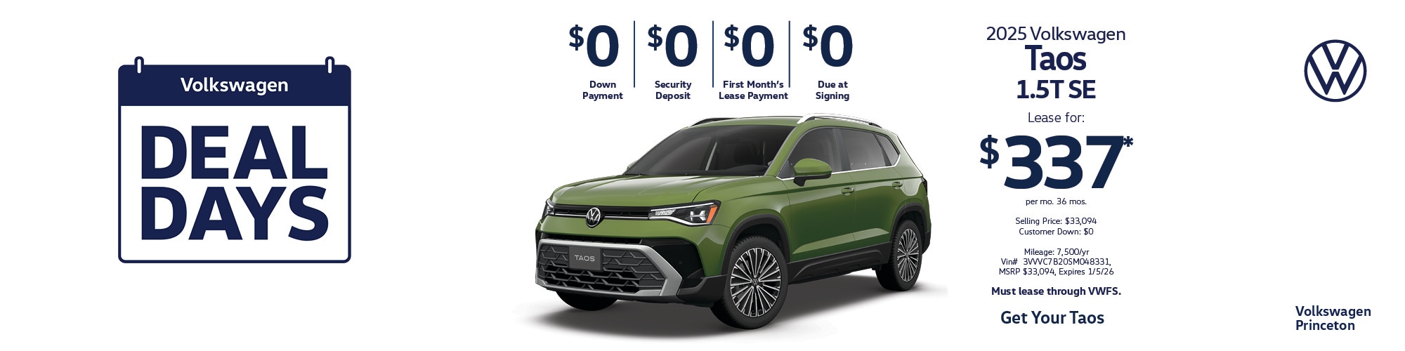 *All prices exclude tax, title, licensing, destination, dealer fees, bank fee, 1st month, & MV fees. Excludes $899 documentation fee. MSRP: $37,091. $0 due at signing plus tax, tags, MV fees & dealer fees. $0 sec dep. Ttl pymt/Residual: $11,340/$24,480.06. Must finance through Volkswagen Credit to qualify. Must finance vehicle at standard rate. See dealer for complete details. Offers expire 1/5/26.